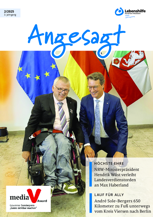 Die Ausgabe über Max Haberland, der den NRW-Landesverdienstorden erhalten hat. André Sole-Berges Lauf nach Berlin. Ein Gespräch der NRW-Selbsthilfe mit Bundessozialministerin Bärbel Bas zum BTHG. In eigener Sache: Die Lebenshilfe NRW hat mit Angesagt den Media-V-Award gewonnen.